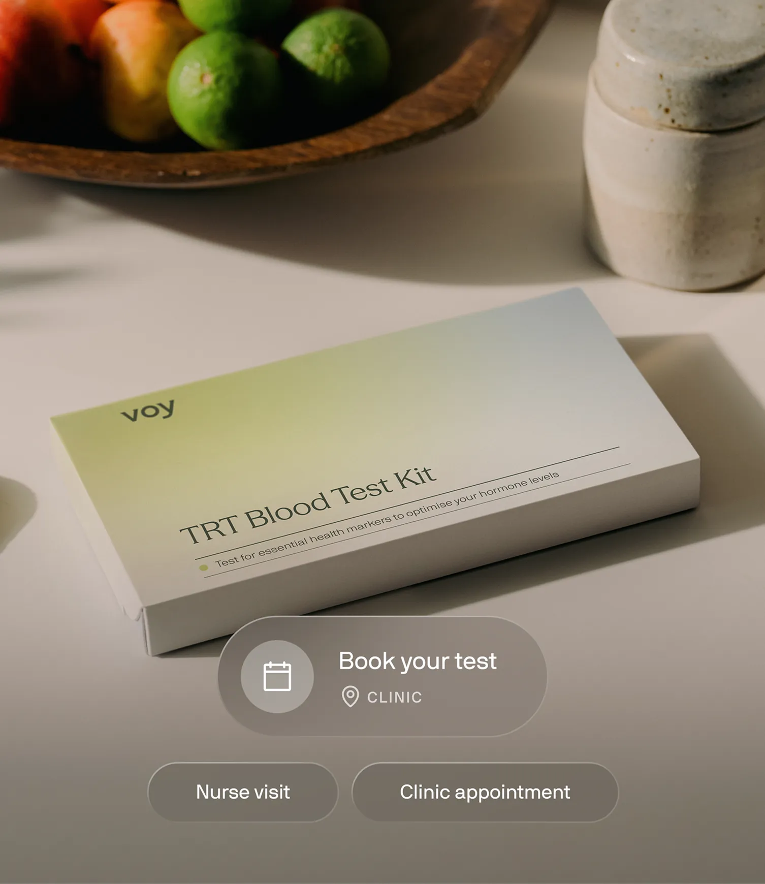 Choose between a clinic visit, home visit, or test kit only (if you know someone qualified to take your sample). If you're under 40, please book the test for before 12pm, when testosterone levels are typically highest.